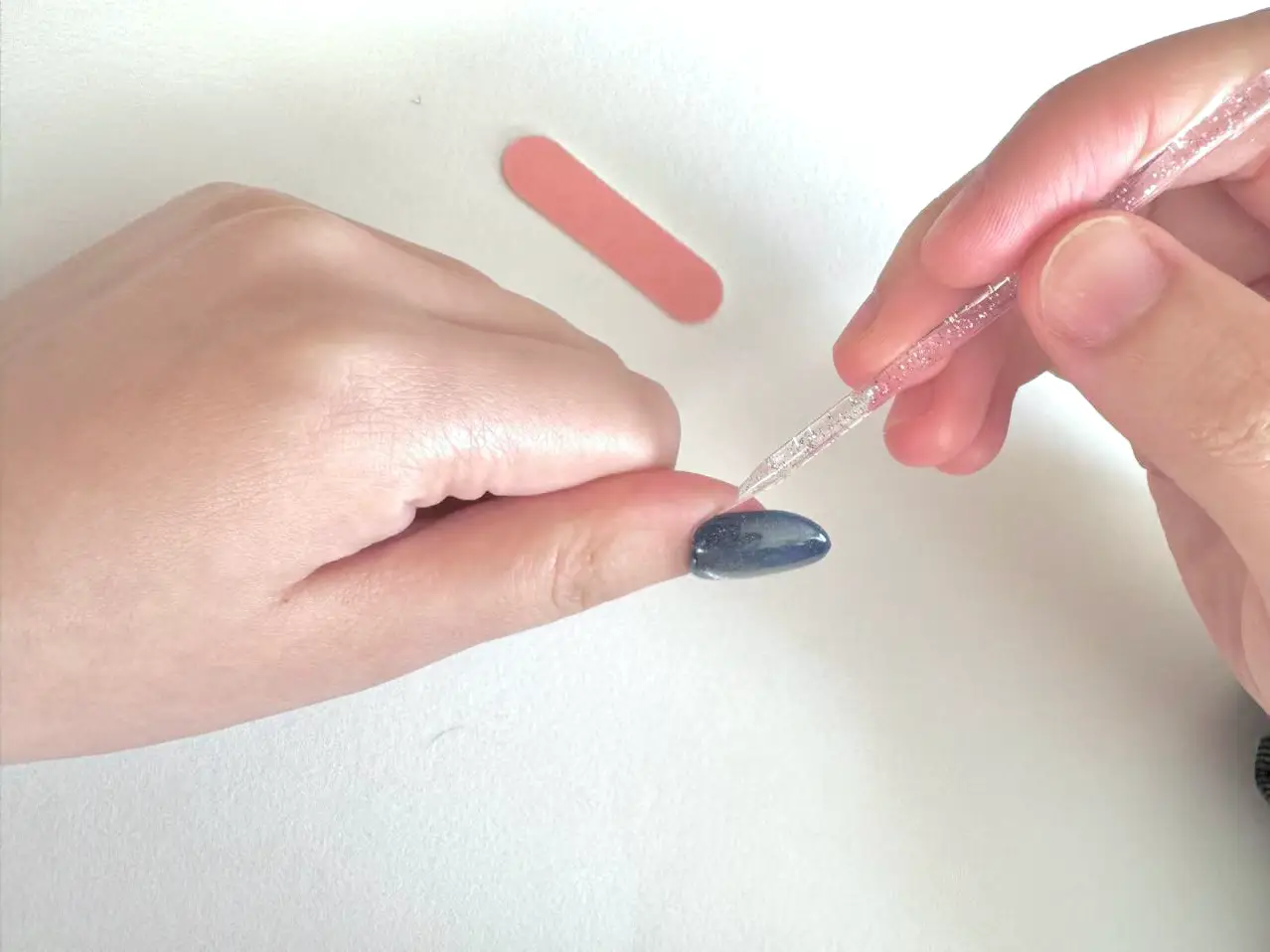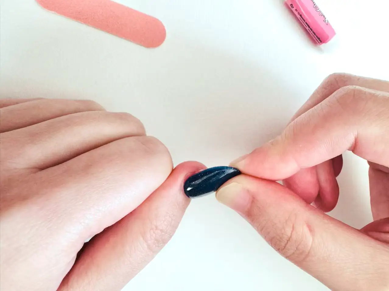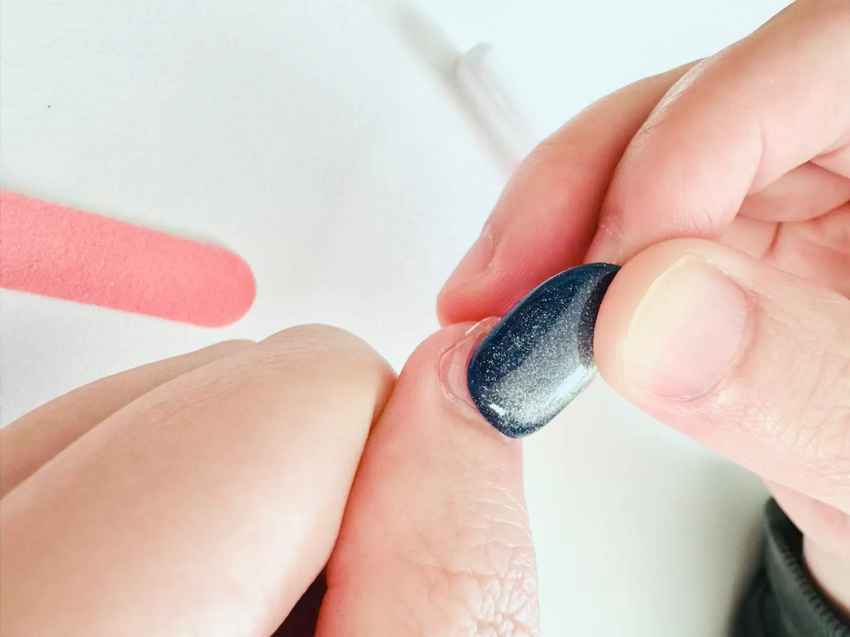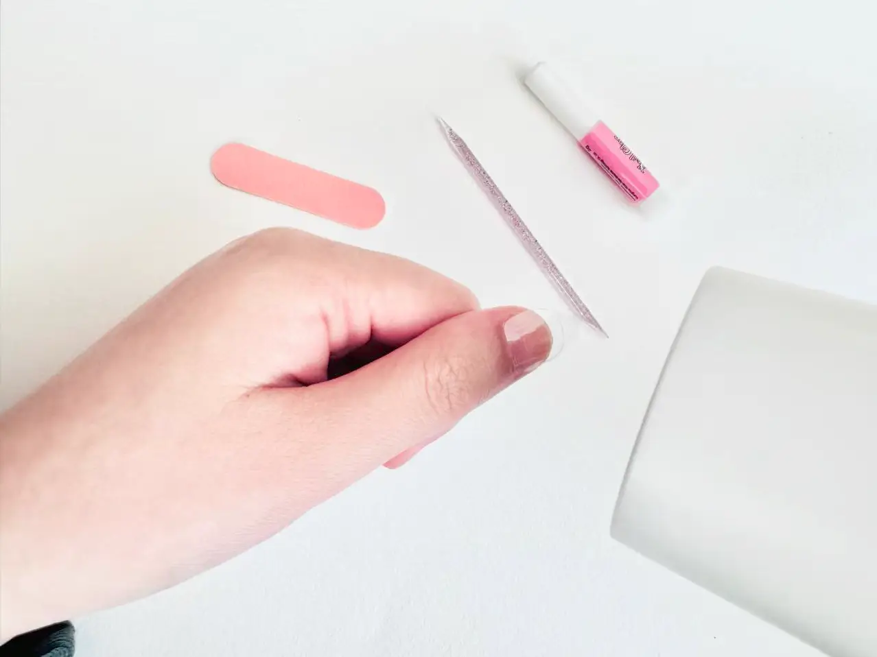 • Buff the Surface: Lightly buff each nail with a mini-file to remove the natural shine. This creates a matte texture for the adhesive to “lock” onto.