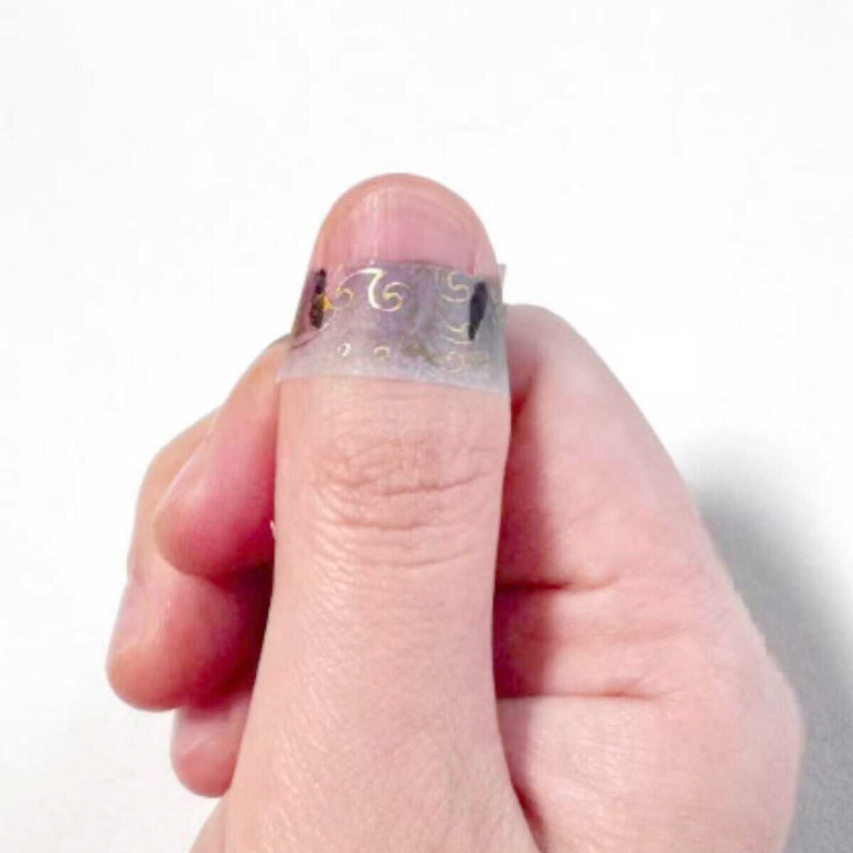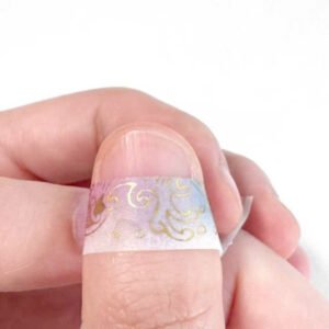 Follow the curve: Press the tape firmly against the nail surface, following its natural arch. Do not pull it straight or leave gaps.