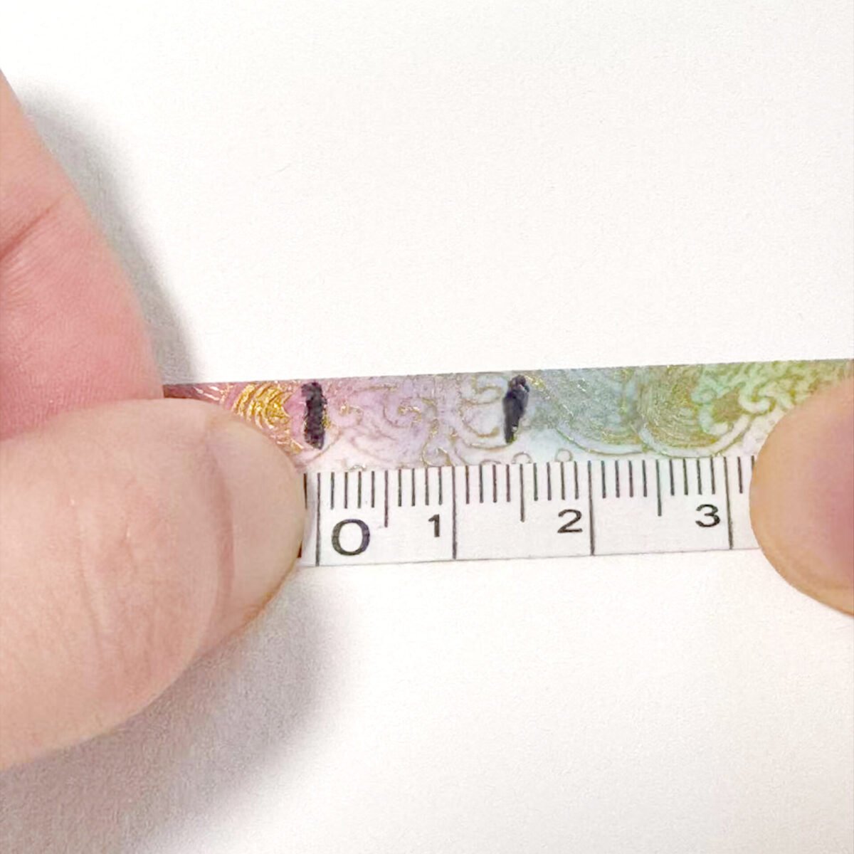 Measure it on a flat surface: Remove the tape and lay it against a ruler to measure the distance between the two marks in mm.