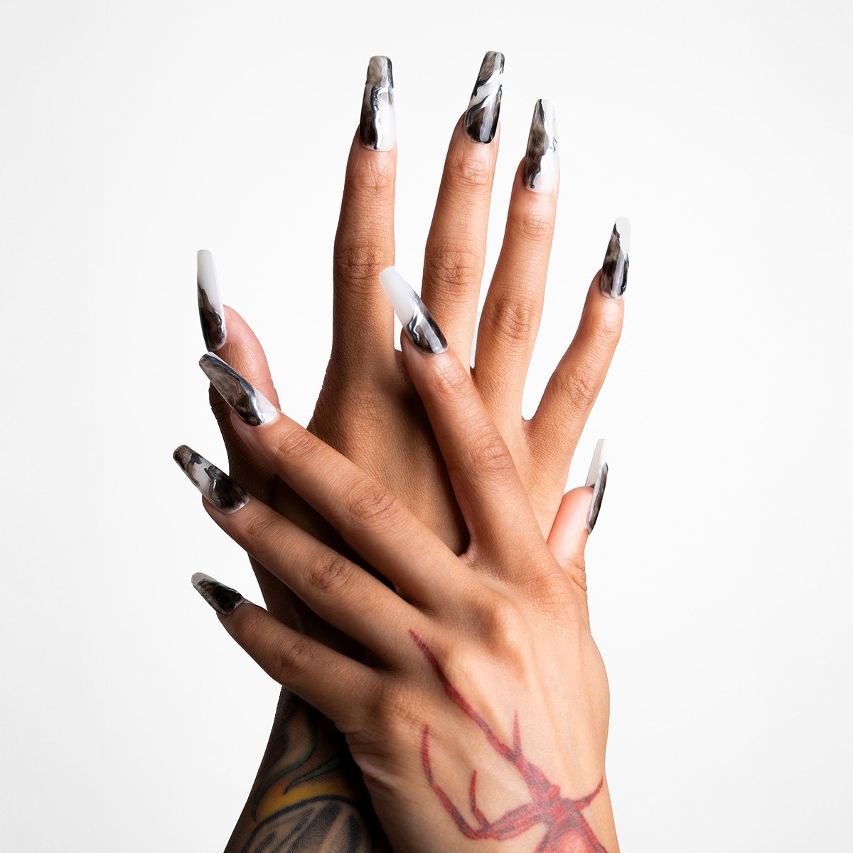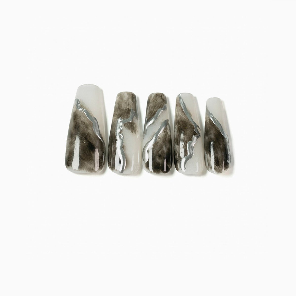 These nails are long-length and square shaped, with the main element being a Chinese ink-wash painting effect on top of a white base. As the final touch, metallic brushstrokes are added to help the ink stand out.
