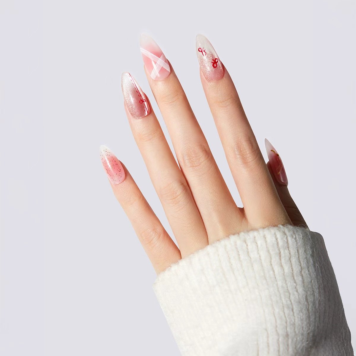 These are medium-length, almond-shaped, handmade press-on nails in a soft blush pink. Featuring shimmer, fine linework, and subtle metallic accents, they bring a light, feminine look with just the right amount of detail — effortless for everyday, yet anything but simple.