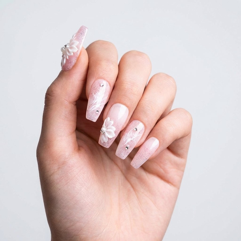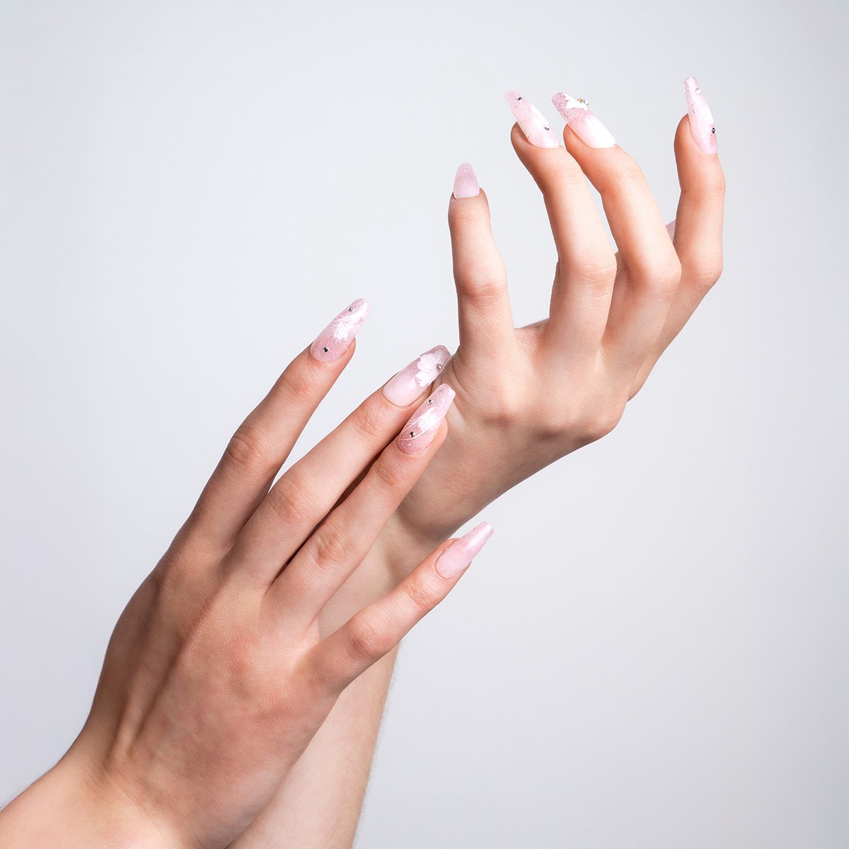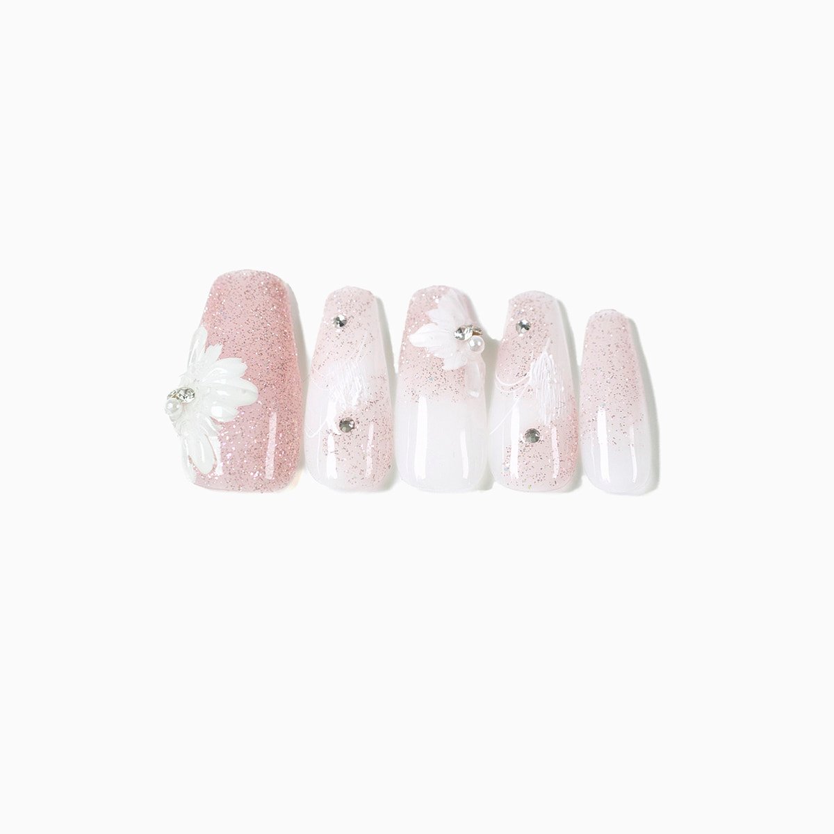 These nails are medium-length, ballerina shaped with a palette revolving primarily between white and pink. This set features floral designs with glittery patches on the base, bringing attention to each decal. To top off the shimmer, rhinestones are included to further enhance the look.