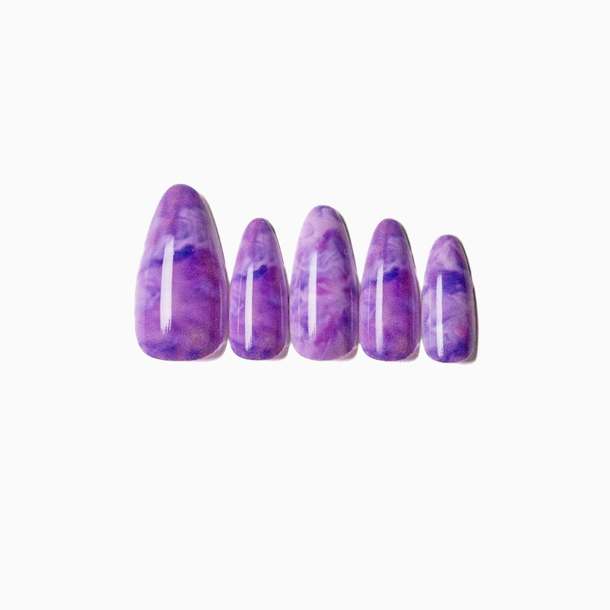 These nails are designed with a medium length and a rounded almond shape. The surface features a swirling marble pattern in rich shades of violet, lavender, and soft lilac, creating a dreamy and artistic effect.