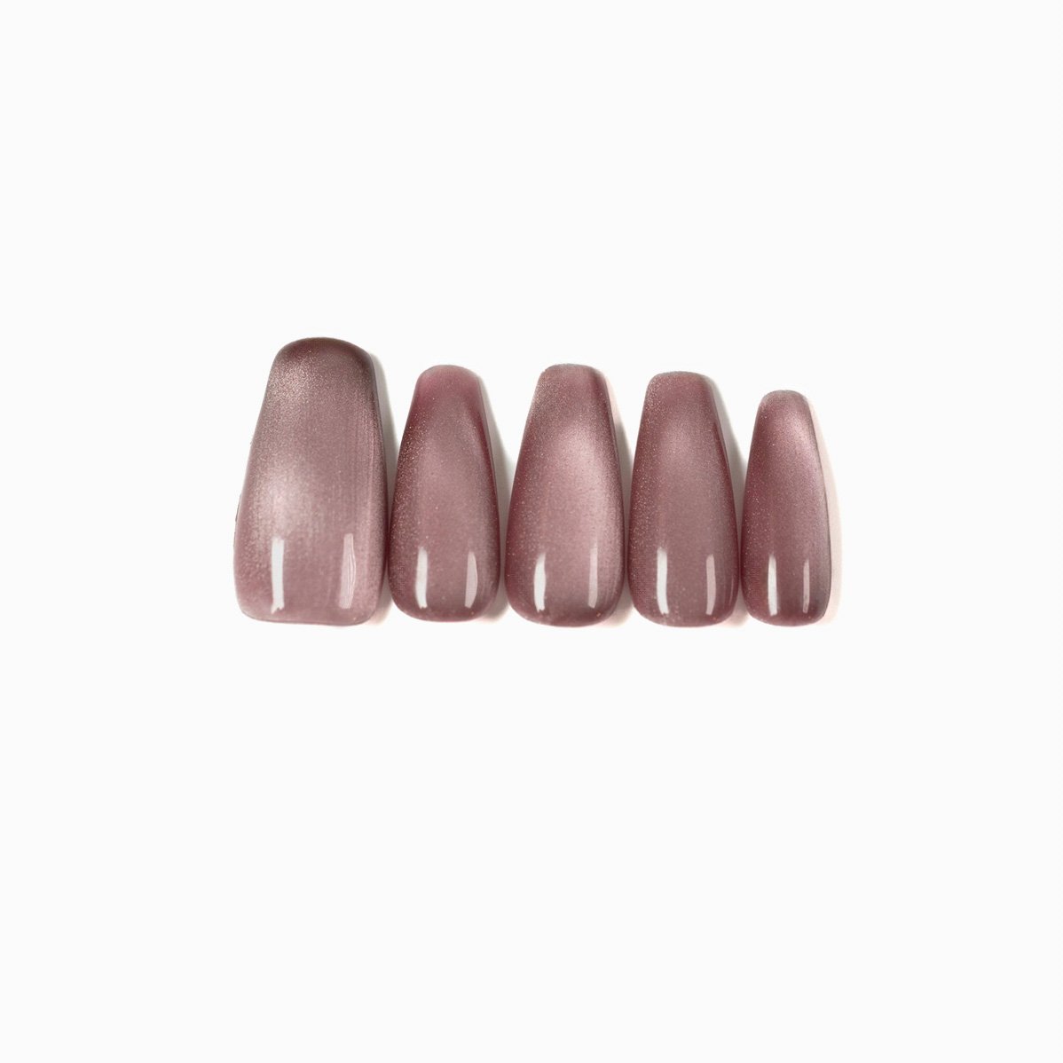 These nails are medium-length, ballerina shaped nails with a soft dusty rose base covered with a cat eye effect. The design results in a unique shine and gradient effect, producing layers of light that create mesmerizing shades on the nails.