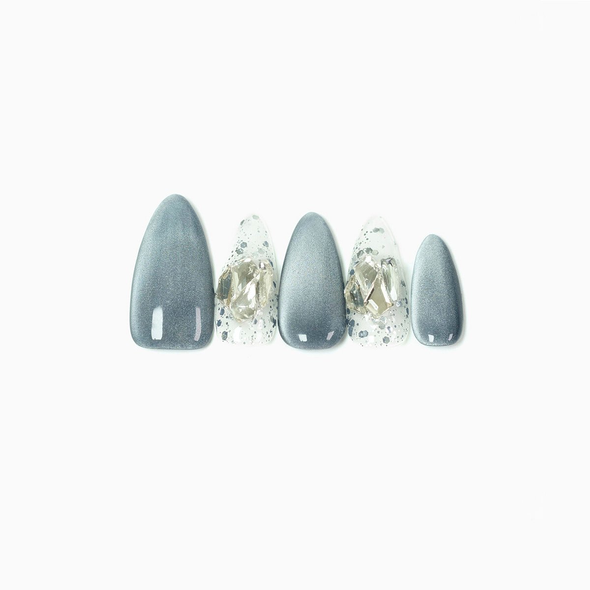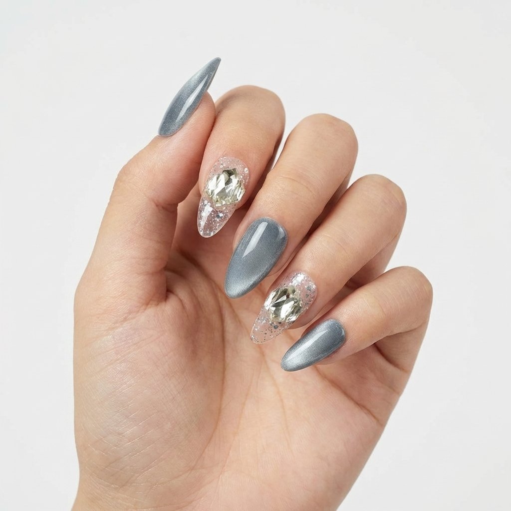 These nails are medium-length, almond consisting of two main components. One being the metallic gray cat’s eye nails, while the other part consists of transparent nails adorned with metallic glitter and large faux diamonds. The embellishments on the transparent nails add depth and visual impact to the overall design, combining a sense of coolness with a futuristic aesthetic.
