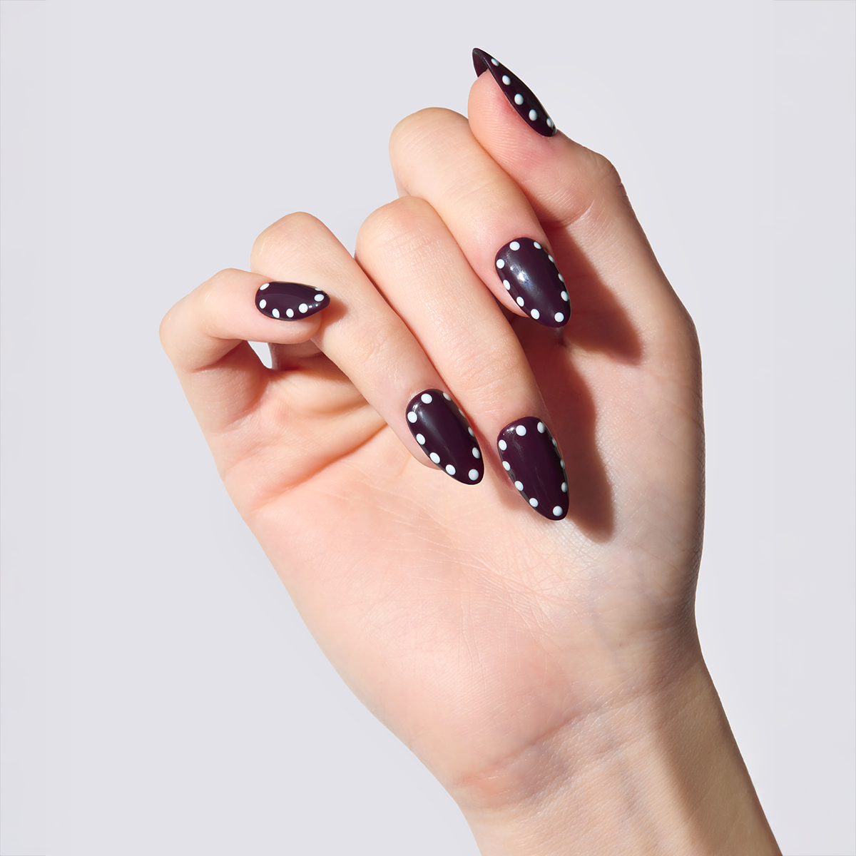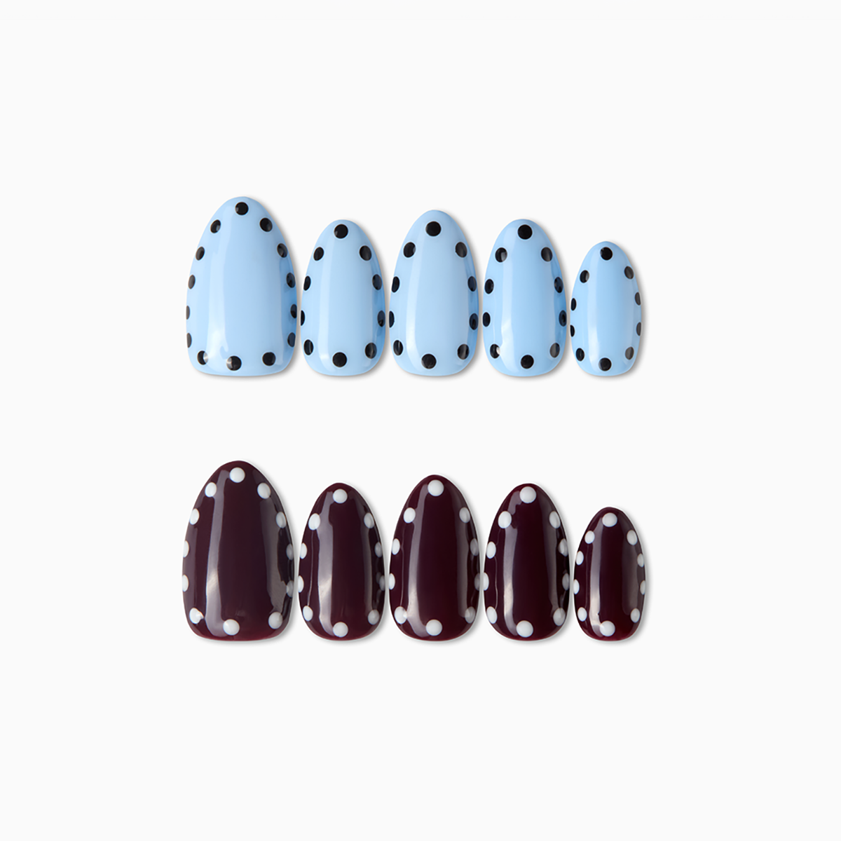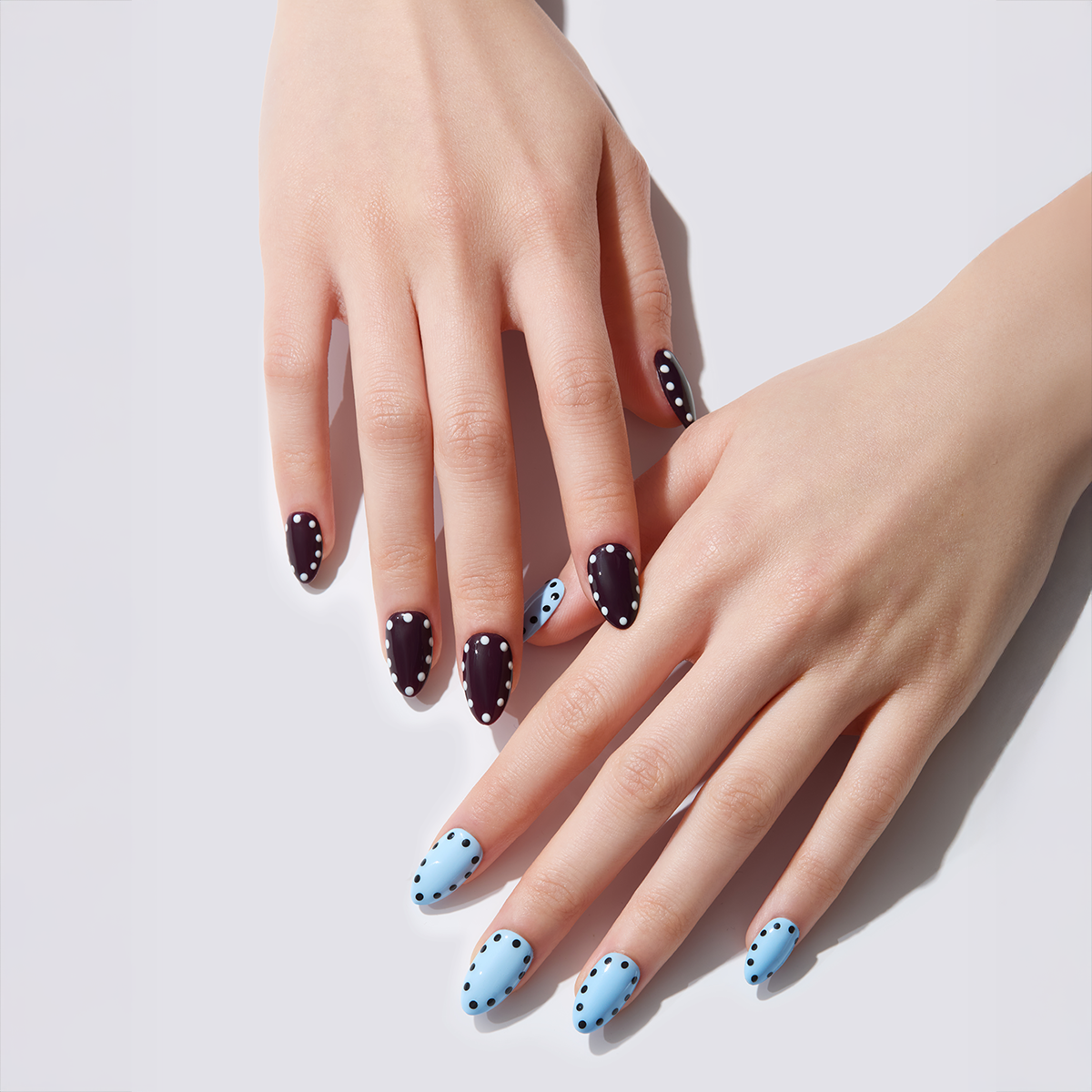 This set of nails is short, almond-shaped nails presented as a dynamic, mismatched duet. One half of the set features a serene baby blue solid base flawlessly framed with crisp black polka dots that follow the natural curve of the nail edges. The other half showcases a deep, glossy burgundy base adorned with bright white polka dots neatly arranged as a high-contrast perimeter “pearl frame.” The bold interplay between the soft, airy blue and the rich, luxurious wine-red creates a striking, graphic pop art finish. This unique two-tone design is perfect for those who embrace eclectic style and want a cohesive yet adventurous look for any occasion.