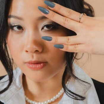 This set of nails are medium-length, almond-shaped nails featuring a dusty mauve base on alternating fingers. The accent nails display a semi-transparent base layered with iridescent flakes in blue and violet tones. One of the nails is molded with a raised seashell texture and adorned with a small gold starfish charm, while others are decorated with faux pearls and small gold studs. The combination of the textured 3D surface and embedded embellishments creates a multi-layered, aquatic-inspired finish.