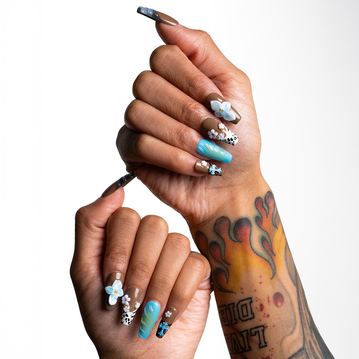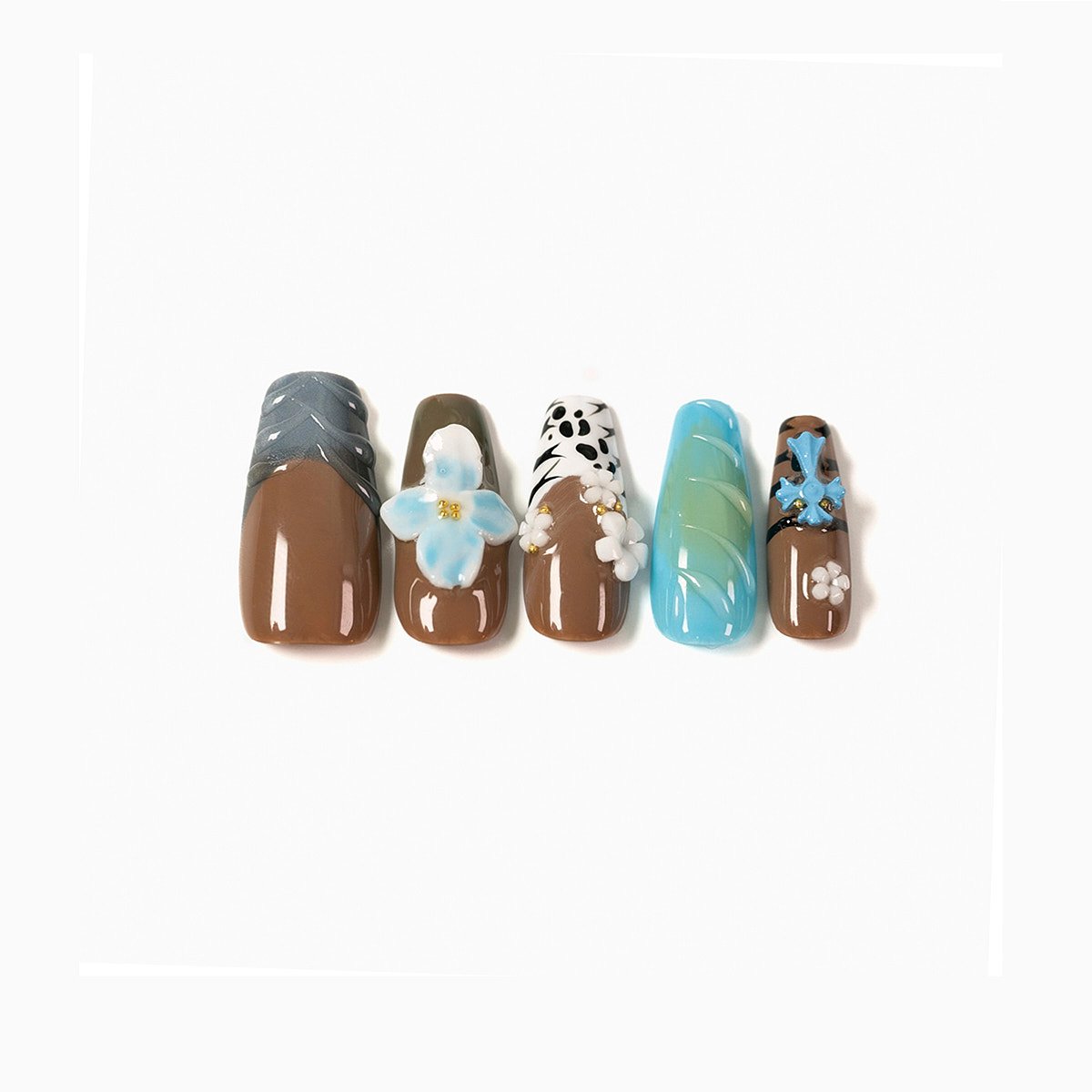 These nails are medium-length, square shaped following a Hawaiian theme. The brown base symbolizes the soil of the Hawaiian Islands, while the flowers correlate to their state flower. The blue-green gradient with swirling patterns evokes clear ocean water and gentle waves. Full of tropical flair, these nails are perfect for the summer!